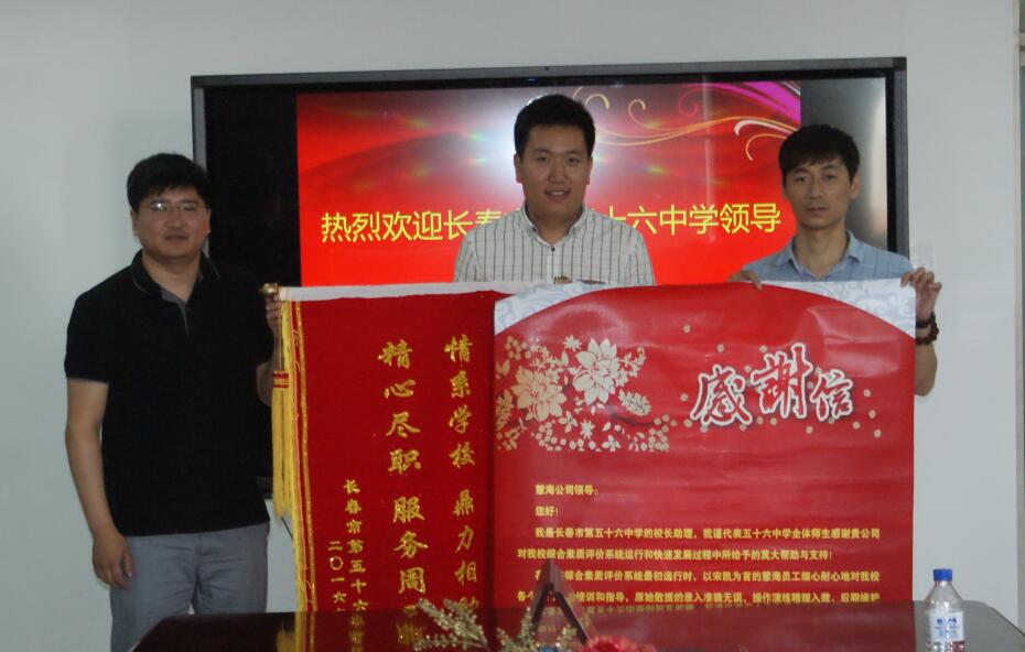 進(jìn)入驕陽似火的七月,我公司再傳喜訊。7月13日,長春市第五十六中學(xué)副校長柳鑫代表學(xué)校來到慧海科技,專程將感謝信與錦旗送到我公司,特別向我公司實施部員工宋凱對五十六中學(xué)素質(zhì)教育綜合評價系統(tǒng)運行和快速發(fā)展過程中給予的幫助和支持表示感謝。
