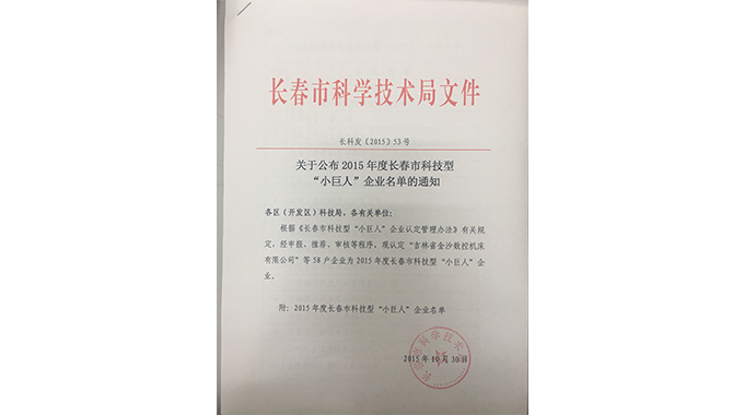 吉林省科技小巨人企業(yè)認定證書
